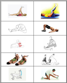 - De cooling-down kan bestaan uit rustig uitlopen en enkele losmakende, ontspannende oefeningen. Voer de rekoefeningen statisch uit. Acht tellen aanspannen, ontspannen en wisselen van been.