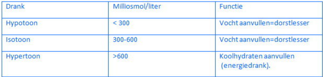 Het aantal opgeloste deeltjes in een drank bepaalt mede hoe snel en gemakkelijk het vocht in je lichaam wordt opgenomen. et aantal opgeloste deeltjes in een vloeistof heet osmolaliteit en wordt uitgedrukt in miliosmol per liter. De lichaamseigen concentratie is ongeveer 300 milliosmol per liter. Sportdrank met een lagere concentratie aan opgeloste deeltjes is hypotoon en wordt gemakkelijk opgenomen in het bloed. (water). De opname van vocht met hoge concentratie (hypertoon) gaat een stuk moeilijker.